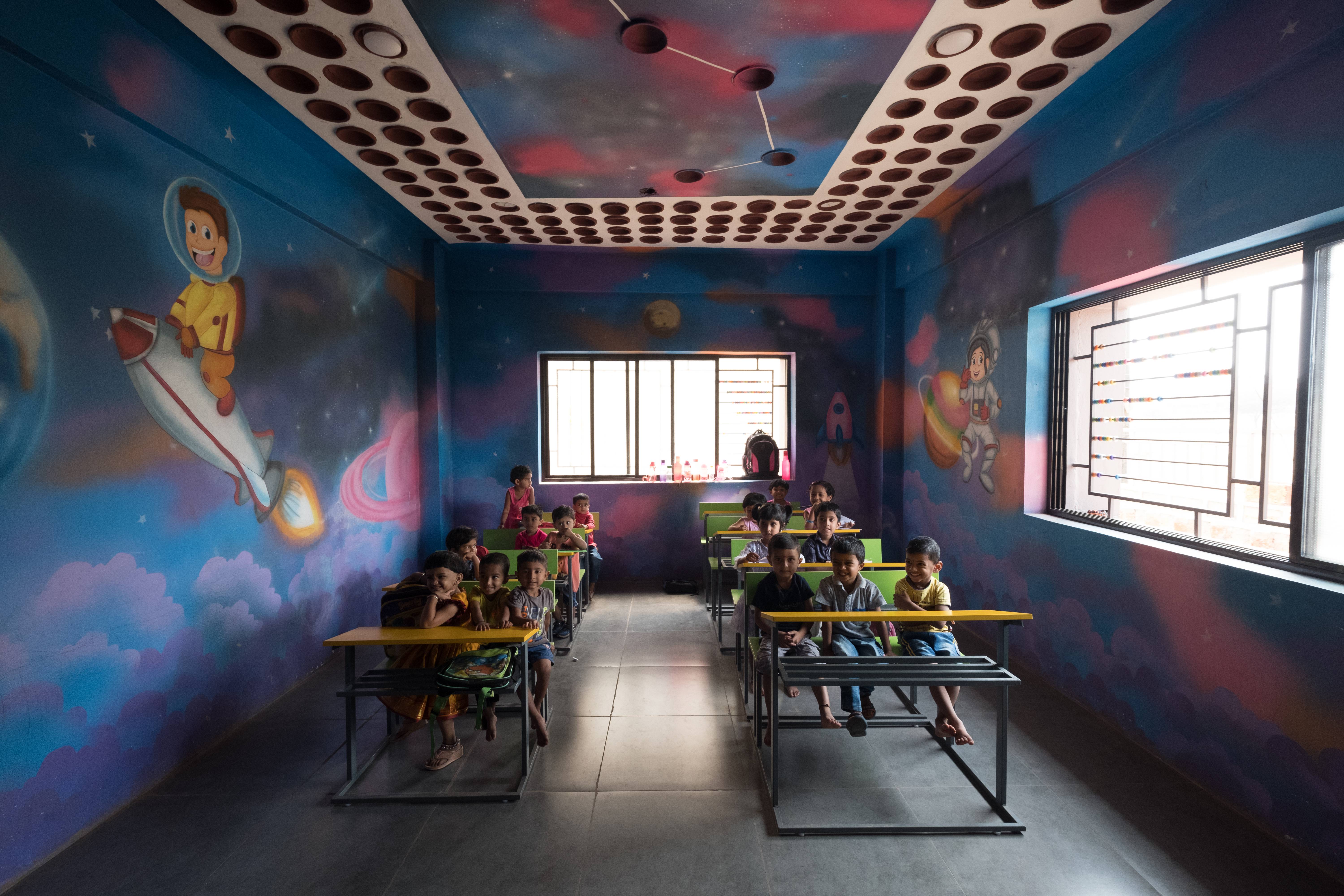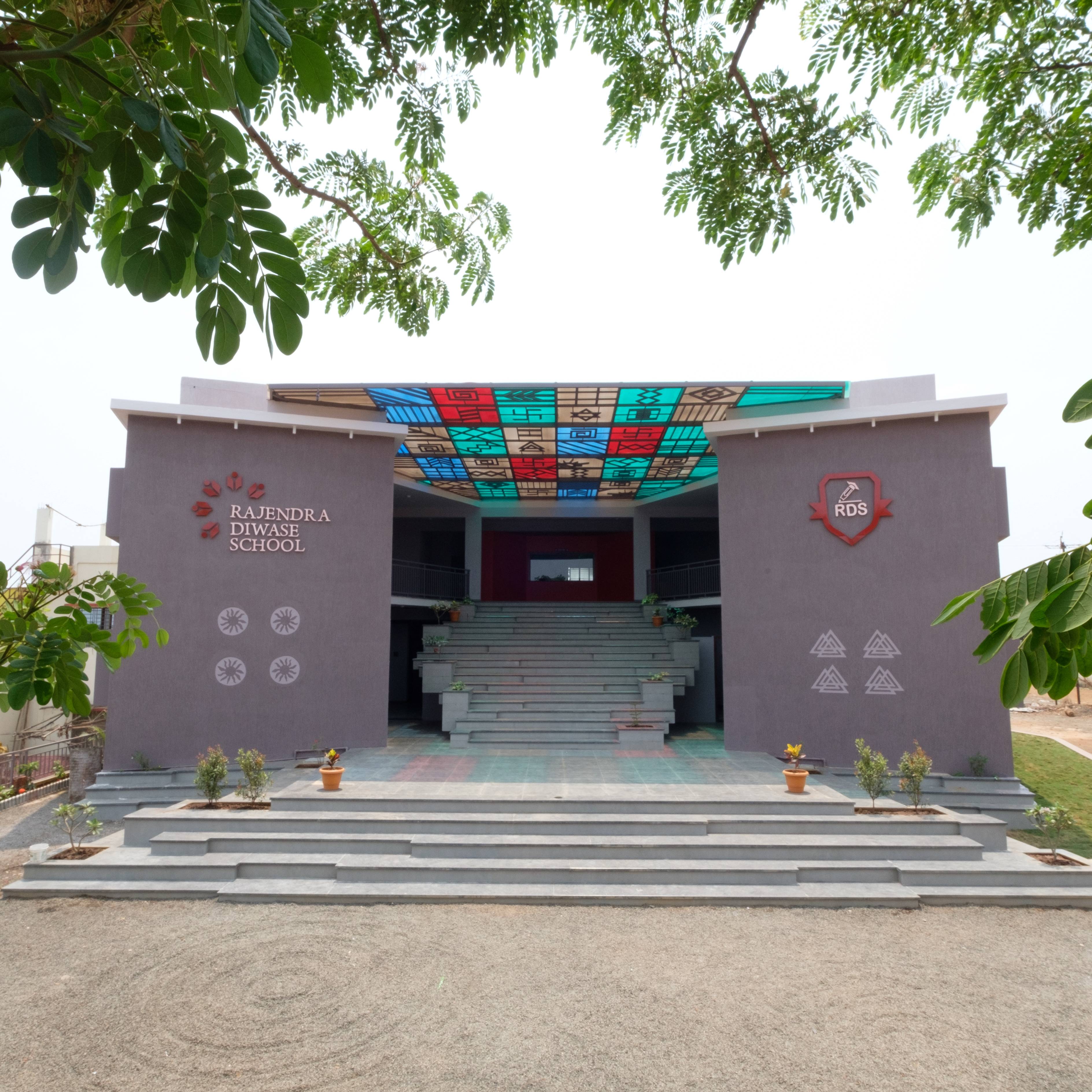 The design aimed to provide quality space and respond to site conditions. Planning evolved around an existing tree, which witnessed the building's journey from start to finish and will continue to witness the journeys of many students. The tree offers comfortable shade for outdoor teaching, embracing the traditional gurukul method. Children play around it, climb its branches, and share tiffin under its shade. Two major axes were generated, forming the built mass, with a flight of steps in the void between, giving character to the building. These steps act as a courtyard, amphitheatre, covered assembly area, and a place for interaction.
